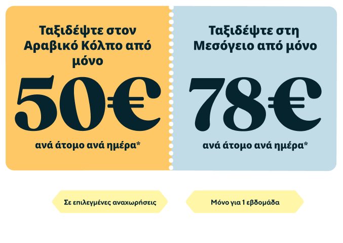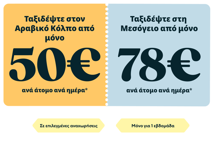 Διαφημιστικό γραφικό με τιμές κρουαζιέρας που παρουσιάζει προσφορές περιορισμένου χρόνου για τα δρομολόγια της Celestyal. Το αριστερό πλαίσιο προβάλλει κρουαζιέρες στον Αραβικό Κόλπο από 57 $ ανά άτομο την ημέρα, ενώ το δεξί πλαίσιο προωθεί κρουαζιέρες στη Μεσόγειο από 91 $ ανά άτομο την ημέρα. Μια διακεκομμένη γραμμή χωρίζει τις δύο προσφορές, μαζί με τις ετικέτες «Επιλεγμένα δρομολόγια» και «Μόνο για 1 εβδομάδα». Οι ημερομηνίες ισχύος της προσφοράς εμφανίζονται ως 26 Νοεμβρίου – 2 Δεκεμβρίου 2025 | Celestyal