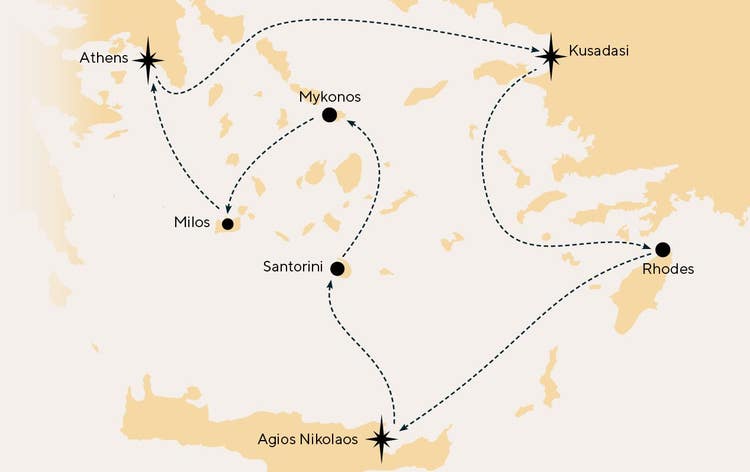 Ανακαλύψτε την πλούσια ιστορία, τον συναρπαστικό πολιτισμό και την πολυτελή κουζίνα των ηλιόλουστων Ελληνικών νησιών. Με πολλά τοπία προς εξερεύνηση, η κρουαζιέρα 7 διανυκτερεύσεων σας προσκαλεί να απολαύσετε τις τοπικές γεύσεις, να θαυμάσετε τα εντυπωσιακά αξιοθέατα και να εξερευνήσετε τα γοητευτικά χωριά. Ακόμη, έχουμε συμπεριλάβει εκδρομές με ξεναγό στη Μεσαιωνική Ακρόπολη της Λίνδου και τη συναρπαστική πόλη της Εφέσου, έναν από τους καλύτερα διατηρημένους αρχαιολογικούς τόπους της Μεσογείου. Η ιδιαίτερη κρουαζιέρα μας σας ταξιδεύει σε μια ρομαντική και ξεκούραστη Οδύσσεια προς τις ηλιόλουστες ακτές, τα ψαροχώρια και τα εμβληματικά αρχαιολογικά τοπία. Με διανυκτερεύσεις στα εντυπωσιακά και πολύβουα νησιά της Σαντορίνης και της Μυκόνου, θα έχετε την ευκαιρία να εξερευνήσετε τα κρυμμένα μυστικά τους και να απολαύσετε την εμπειρία της αυθεντικής Μεσογειακής κουζίνας και του Ελληνικού τρόπου ζωής