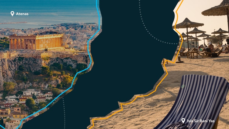 Imagen dividida con temática de viajes que muestra Dubái y Cefalonia. En la parte izquierda aparece una pareja disfrutando de una experiencia con shisha en el desierto de Dubái al atardecer, rodeada de dunas de arena dorada. En la parte derecha se destacan las aguas cristalinas y los coloridos barcos de pesca de la pintoresca costa de Cefalonia. Un mapa estilizado divide los dos destinos, con etiquetas para Dubái y Cefalonia, promocionando los cruceros por Oriente Medio y el Mediterráneo | Celestyal