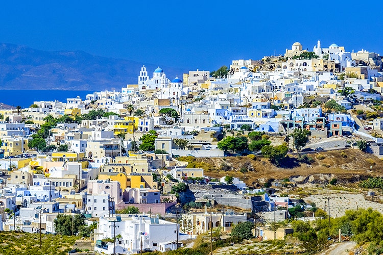 Partiremos desde Athinios y subiremos las colinas en autocar, contemplando el impresionante paisaje que se abre paso a cada curva de la carretera. Pasaremos por Pyrgos, la antigua capital, y podremos ver los viñedos en las laderas.