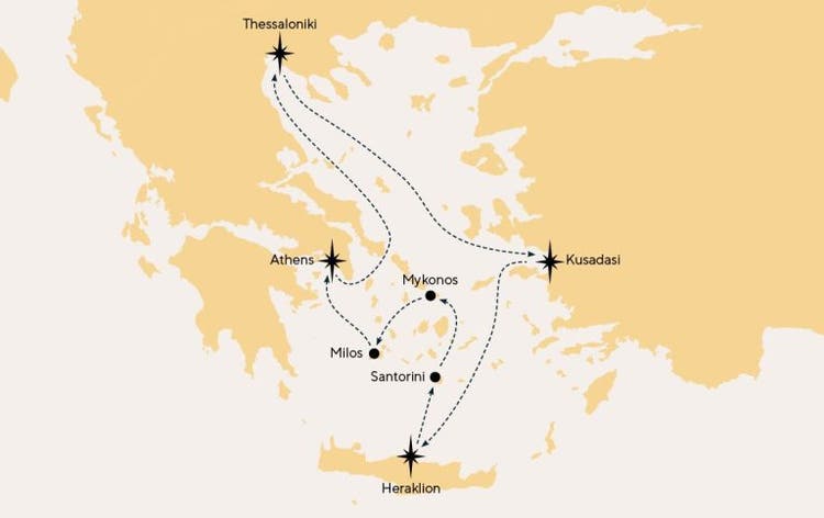 Discover the rich history, fascinating culture and sumptuous cuisine of the sun-soaked Greek islands. With vivid landscapes to explore, our 7-night 2026 Greece cruise invites you to indulge in traditional flavors, admire stunning landscapes and explore charming villages. We even include guided visits to the Medieval Acropolis of Lindos and the intriguing city of Ephesus, one of the best-preserved archaeological sites in the Mediterranean. Sailing through Kusadasi to Rhodes and beyond, our extra special cruise takes you on a romantic and effortless Odyssey to sun-soaked shores, quaint fishing villages, and iconic historical sites. With overnights stops in the stunningly beautiful and buzzing islands of Santorini and Mykonos, you will have the opportunity to discover hidden secrets and indulge in an authentic experience of Mediterranean cuisine and the classic Greek lifestyle.