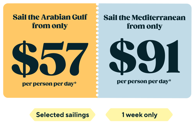 Promotional cruise pricing graphic showing limited-time offers for Celestyal sailings. The left panel advertises Arabian Gulf cruises from $57 per person per day, while the right panel promotes Mediterranean cruises from $91 per person per day. A dotted line divides the two offers, with labels reading “Selected sailings” and “1 week only,” and the sale dates shown as 26th Nov – 2nd Dec 2025 | Celestyal